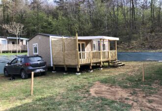 Our mobile homes blend perfectly into our campsite surrounded by the forest, with their wooden cladding and spacious plots where you can park your vehicle. This mobile home is located in the valley behind the building, where you’ll enjoy great sunshine but also a mobilhome 3 bedrooms comfort+ with air-conditioning to provide all the coolness you need.